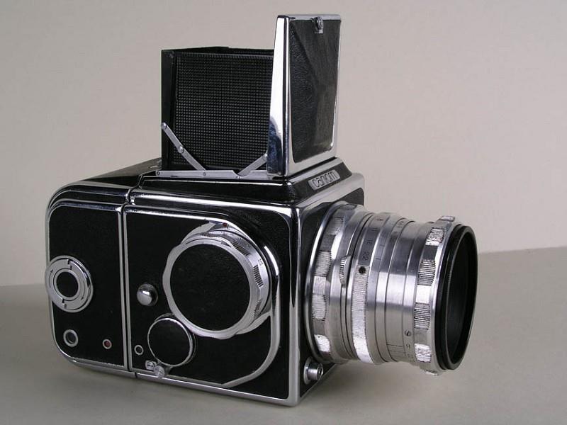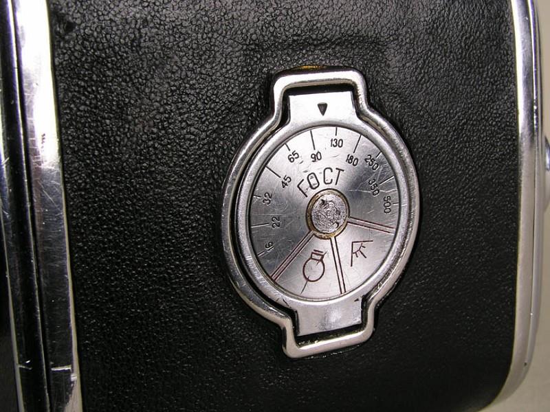 Shown is the first version of Salyut after the pre-series. It features a shutter speed of 1/1500 and has a self-timer located beneath the shutter cocking / speed dial. Also visible is the chrome speed dial, where later versions of Salyut had a black or black and chrome dial.