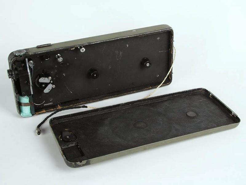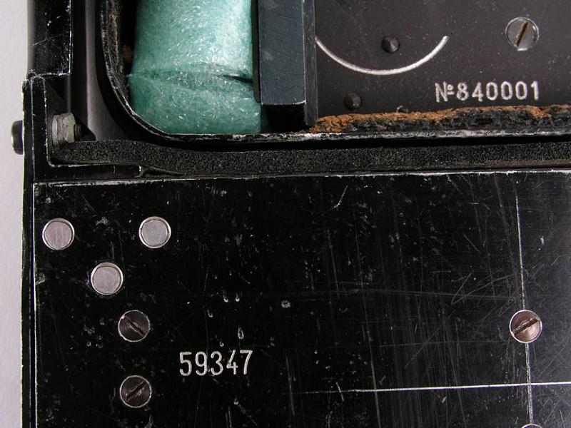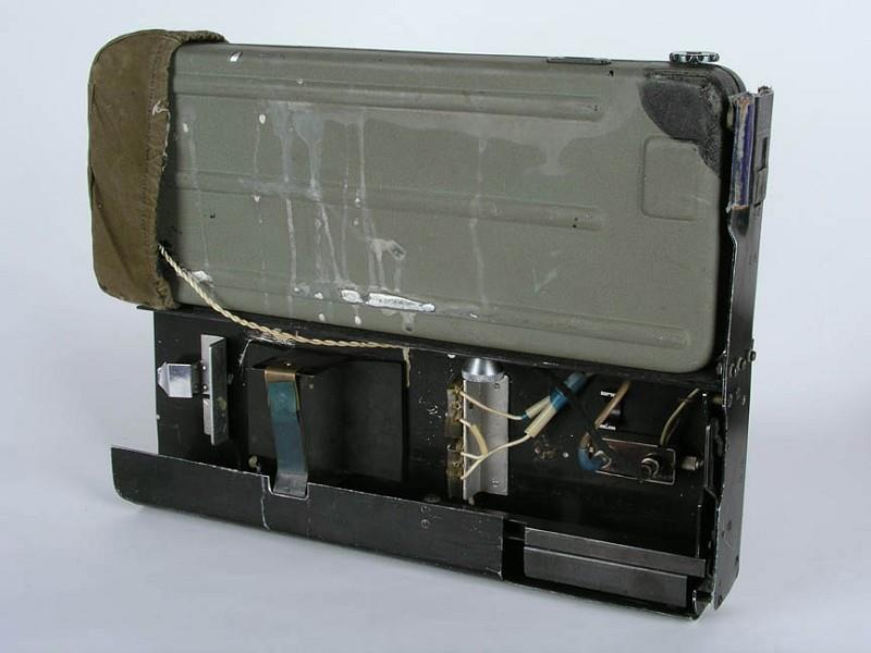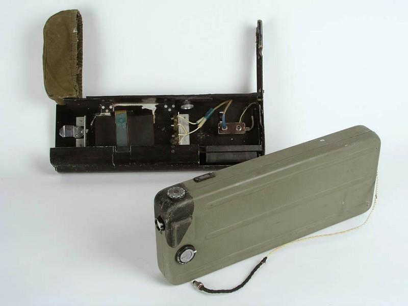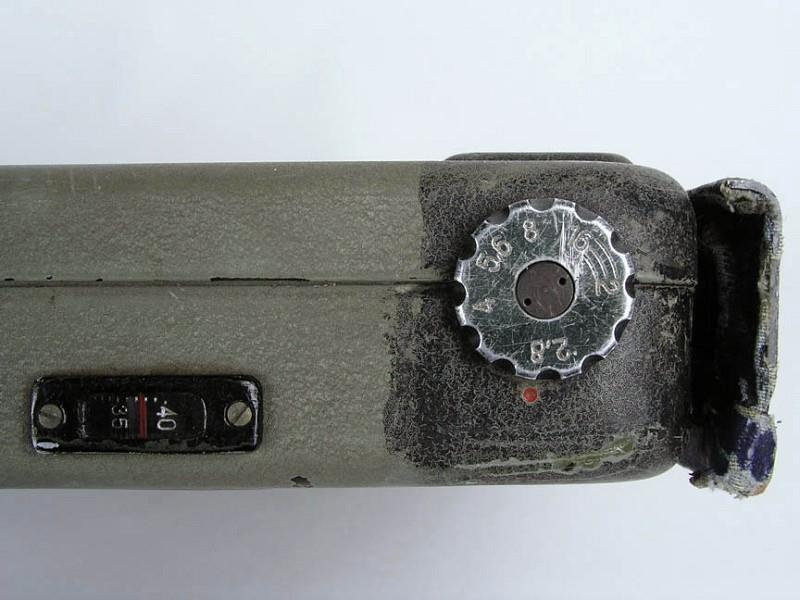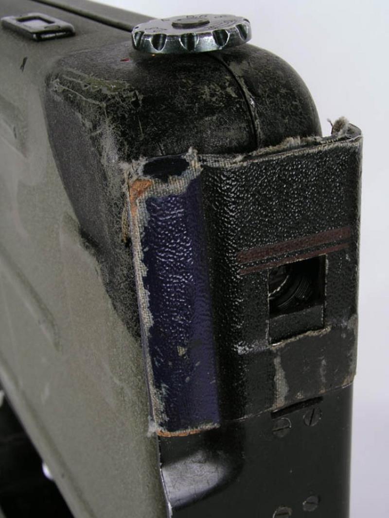 The Imbir shown is still coupled with its KGB workshop-made device that allows it to work, concealed in a briefcase. The briefcase shown did not come with this set and is just for illustration purposes. The black metal device has a trigger which opens a window and at the same time triggers the camera to start filming. It has a place for a large battery and the switches that operate the camera are exposed. The device has a serial number of 59347 and so probably dates from 1959. It also has a cloth label which reads "ONLY LOAD 30 METER FILM", a warning to the agent who uses it!