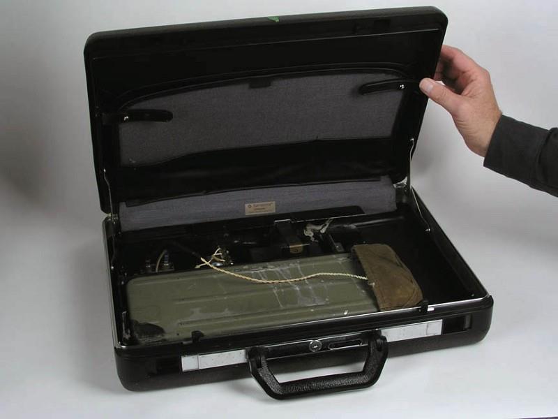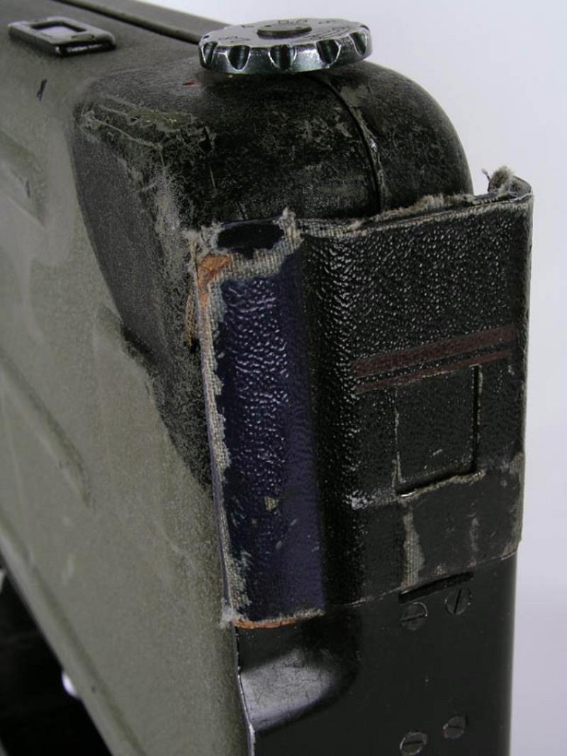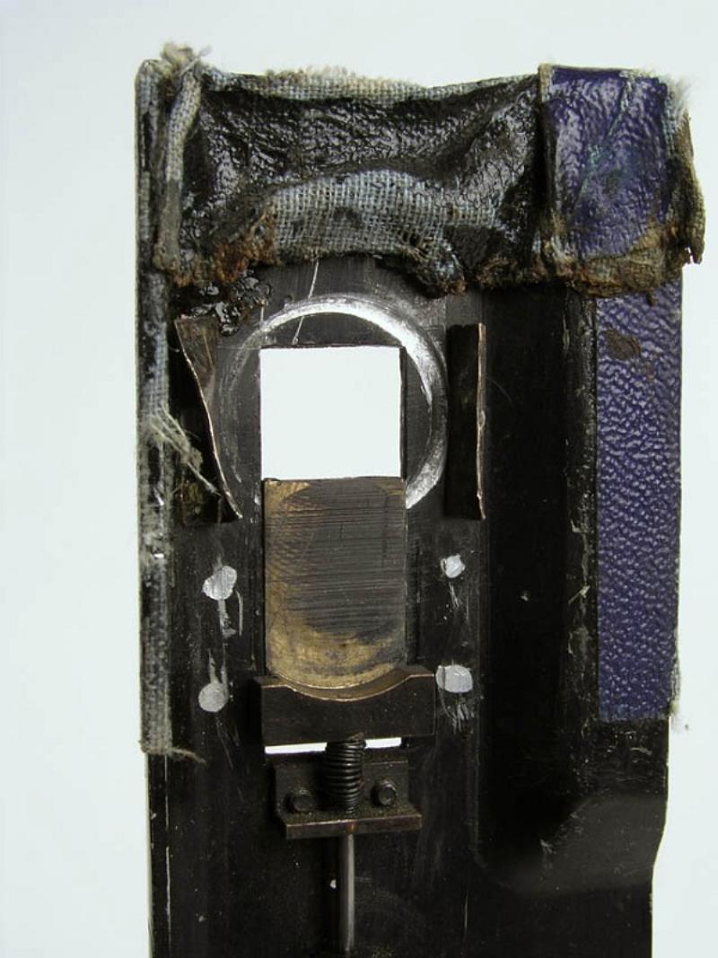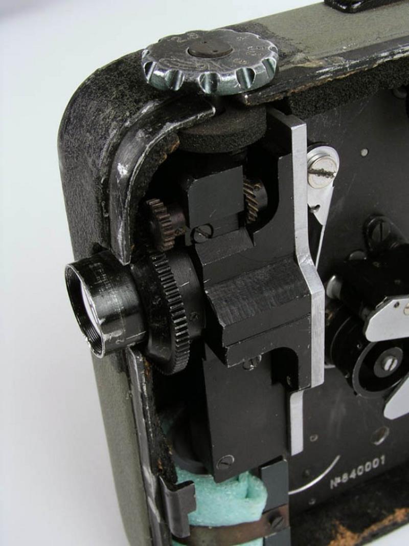 The Imbir shown is still coupled with its KGB workshop-made device that allows it to work, concealed in a briefcase. The briefcase shown did not come with this set and is just for illustration purposes. The black metal device has a trigger which opens a window and at the same time triggers the camera to start filming. It has a place for a large battery and the switches that operate the camera are exposed. The device has a serial number of 59347 and so probably dates from 1959. It also has a cloth label which reads "ONLY LOAD 30 METER FILM", a warning to the agent who uses it!