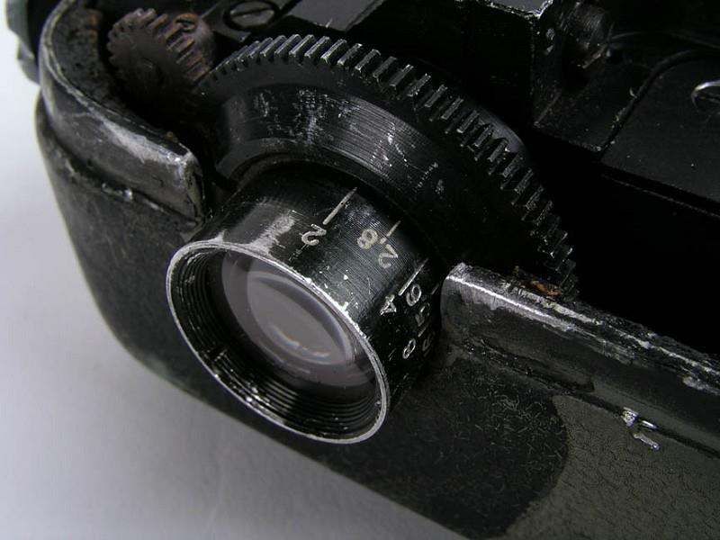 When the camera is open, you can see some green-blue foam which serves to wrap the small electric motor that runs the camera and make it quiet so the subject of the film or bystanders will not hear a funny sound coming from the "innocent" agent's briefcase! The small f/2.0 - 28 mm lens seems to be fixed at a fixed focus, although I believe were different lenses for this camera. The Imbir takes double perforated 16 mm film and films at 16 frames per second. The power source is 9 volts / 0,3 amps.