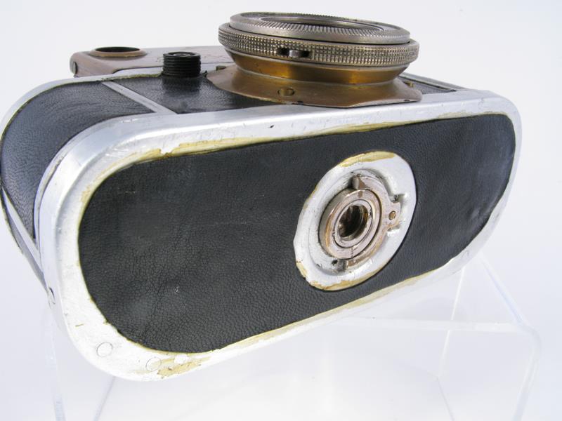 Mass produced model of the GELVETA. The back of the camera is like the CONTAX. The system of changing film was by 35mm automatic film cassette designed especially for the SPORT. A fully loaded film cassette gave 50 exposures 24x36. The front of the viewfinder was engraved with the GOMZ sign and the glass finder was coloured yellow/orange. The viewfinder strap pins replaced by a decorative rectangular ring surrounding the eye-piece. The top-plate held first by 6 screws and then by 2. In spite of the bayonet, no other focals other than the f3.5/50mm.