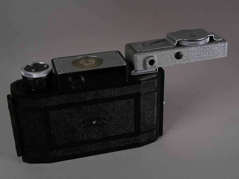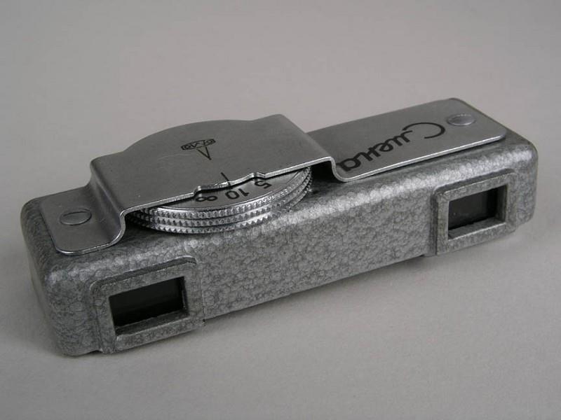 It has a gray metalic "hammered" finish, like the Kristal camera, and comes in a nice leather carrying case. Slides onto the accessory shoe, look through eyepiece in back, align the two images, read out the focusing distance on the wheel, set the lens to that distance.