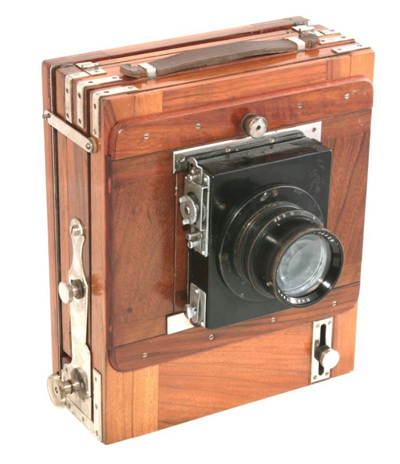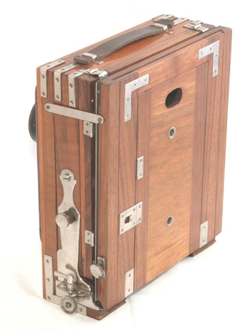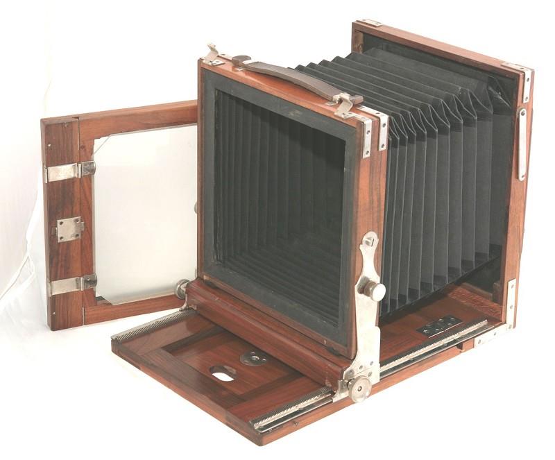 Hammer and sickle logo on Thornton-Pickard type curtain shutter and Industar-4 (1:4/210 mm, 56 deg.) lens.