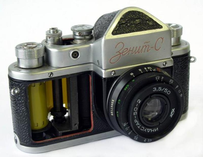 Camera identical to mass market Zenit-C, but with cutouts for process demonstrating.