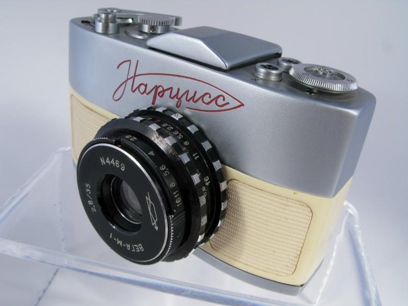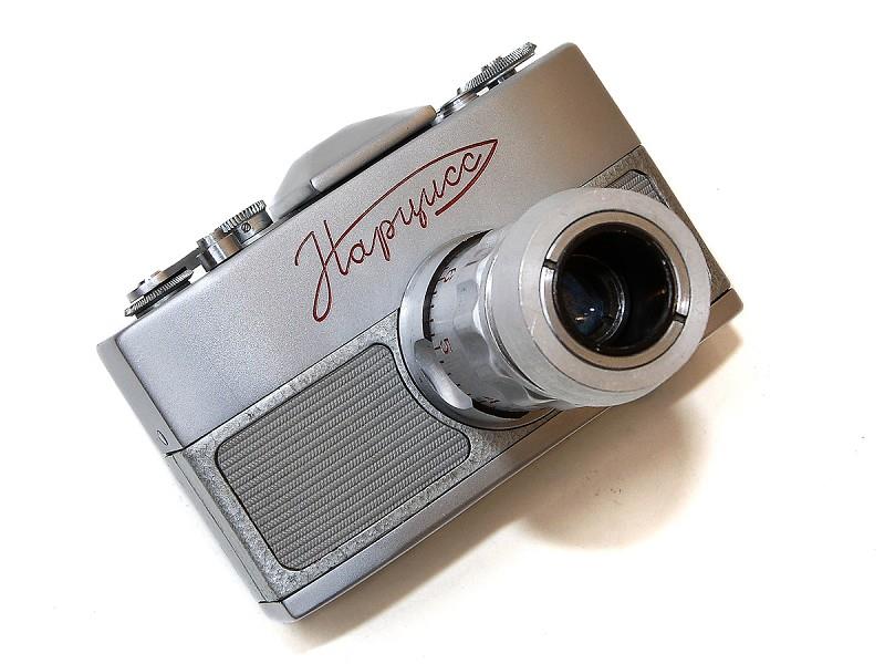 The top is engraved directly over the lens with Narciss, in either Cyrillic or Roman and red filled. These cameras were originally packaged with case, film cassettes and a developing spool. The package also included a special lens adapter that functioned as an extension tube or to adapt m42 lenses for use on the Narciss.
