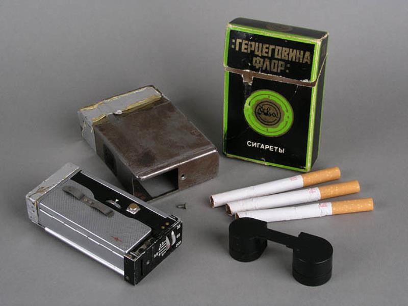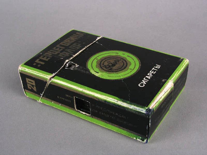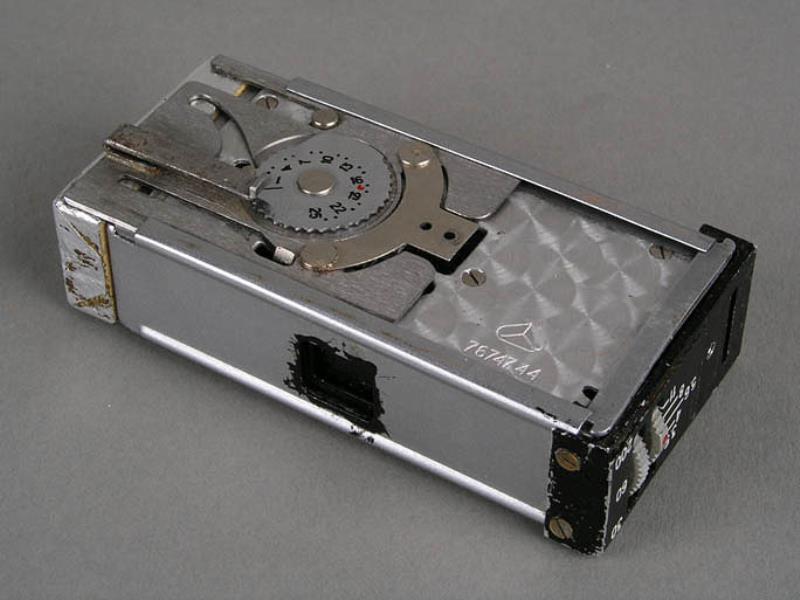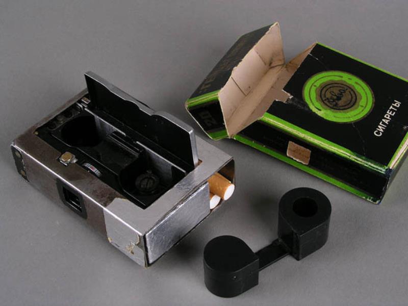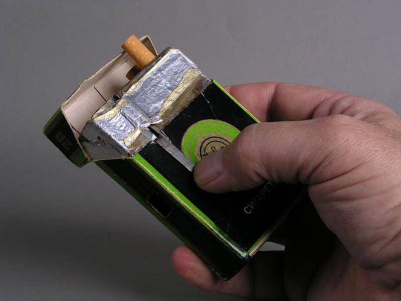 Notes: This camera looks to have been well used, as evidenced by wear and patina to the cigarette pack disguise. Some say that cameras such as this were used by the KGB or Stasi, and Princelle says that these cameras were "massive smoke screens covering for the true spy cameras of the F-21 or "Totchka" type". This camera looks a bit well-used to have been put out as just a smoke screen, but who actually used it and why is a mystery. .... The clip that is visible in the front is used to cock the shutter by pulling it down. It has been soldered onto the body of the camera. .... There is a round brass button soldered onto the camera's shutter button that allows the shutter to be tripped by pressing the back of the cigarette pack in the right spot.