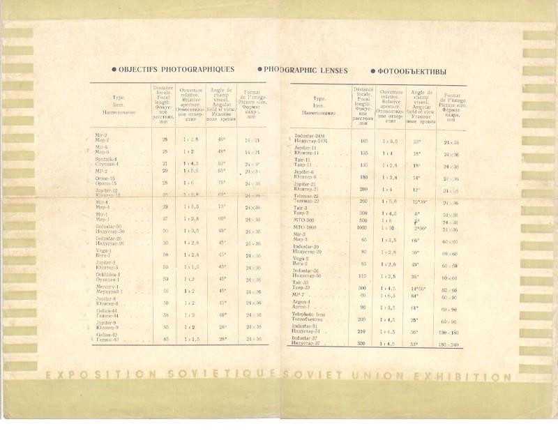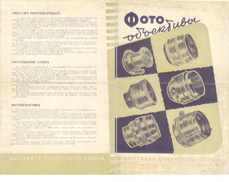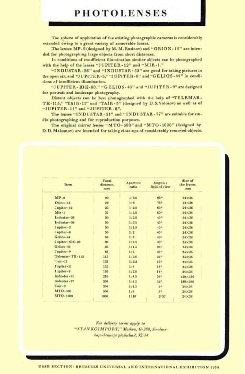 Two delightfull prospectuses! The first one picked from Zenit-Istra site The second from my collection. Both from the 1958 Brussels Exhibition. Now doing 50 years! Special attention to Jupiter YuK 80 2.5/80mm, and Telemar TK 115 5.6/115mm lenses for the 24x36mm format. These lenses were intended to be made for the first version of Leningrad camera. -The GOI Leningrad. But together an Helios 44 version, also intended fot the rangefinder “Kadr” Shown in pictures in the 1958 Brussels Fair. Also must be noted the 6x9 lenses made for Argon camera suposedly shown in pictures in that same exhibition – The MR-7 6.3/60mm (shown in Bronstein’s site – Leica Boom). The Argon-1 3.5/90mm adapted from an aerial camera “AFA-1” and the Teleobjektiv 4.5/200mm. The Mir 3 3.5/65mm the Industar 29 2.8/80mm, the Vega 2 2.8/85mm, the Industar 56 2.8/110mm, and the Tair 33 (recalculated Tair 30) 4.5/300mm intended for the Saliut first version. See also Mir 2 and Mir 6 for the Narciss. This in 1958! And Orkhidea 1, Merkury 1, and Helios 40 for the fabulous “Kometa” The Sputnik4 reproduced the famous Biogon of the era. The Mir4 really was a prototype of the Meyer Orestegon later introduced for Praktica cameras The Vega 1 fist used on the first version of Kristall 2 ! And the Jupiter 6 directly inherited from the 1936 Sonnar Olympiad! I included a Stankoimport leaflet of the MTO 1000. The first commercial lens of this type. Stankoimport was the first and sole USSR exporter of tools and optical devices.
