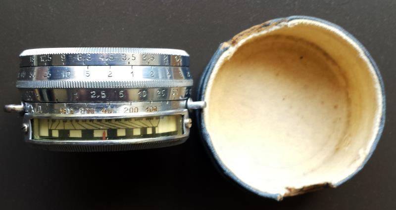 This meter has its factory original, fabric-covered, felt-lined inner box and outer box. The outer box has Cyrillic writing in pen on the inside lid, which reads: "Exposuremeter 1222/300". This light meter was bought during World War II, along with a FED camera, by American photographer, C. L. Sands, and bears his name on the top lid of the outer box. The meter reacts only slightly to strong light due to a worn out selenium cell.