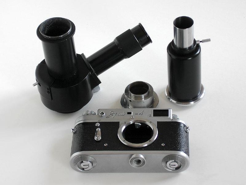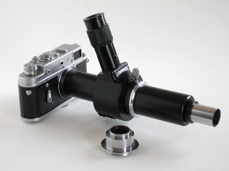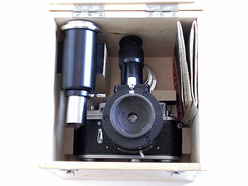 It is composed of a standard Zorki 4 camera, a reflex box with viewing eyepiece, a long connection tube and a short one, plus manuals and passport, all enclosed in a nice wooden box.